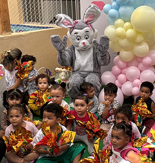 Todos os anos, o Instituto realiza a Páscoa Solidária com apoio da Cacau Show.Em 2025, doamos mais de 900 ovos de Páscoa, ampliando a ação para comunidades parceiras e fortalecendo vínculos para além das unidades educacionais.